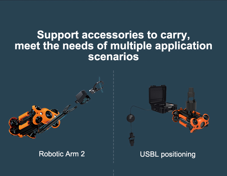 Underwater robot P2 is a light industrial-grade underwater robot designed for professional users, government agencies, enterprises and organizations. It adopts 8-thruster full-vector layout, which can realize 360-degree movement. Compared with JTT-P1, the motor power is upgraded by 50%, the maximum speed is 4 knots, the depth is 150 meters, and the maximum horizontal radius is 400 meters. The ROV can support a mixture of AC and battery power for unlimited endurance. In addition to general accessories such as robot arm, searchlight and laser caliper, it also supports a variety of exclusive ROV advanced accessories such as high-light screen control box, multi-interface docking station, 700Wh battery, USBL underwater positioning, multi-beam image sonar and external camera. Built-in 4K/12 megapixel EIS anti-shake camera, 4000 lumen LED light, removable/replaceable battery, and pluggable Micro SD card. The aluminum alloy compact body (weight less than 6KG) can be quickly deployed in 3 minutes by single operator, making it as a lightweight, easy-to-use and reliable light industrial grade underwater robot.